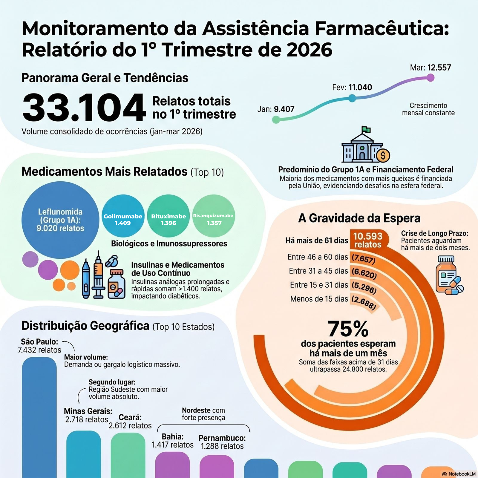 O primeiro trimestre de 2026 revelou um cenário alarmante para os pacientes que dependem do Sistema Único de Saúde (SUS). O Movimento Medicamento no Tempo Certo (#MTC) registrou 33.104 relatos de irregularidades e desabastecimento envolvendo 58 componentes da assistência farmacêutica. O número representa um agravamento crítico no acesso, deixando pacientes com doenças crônicas, imunomediadas, raras e oncológicas à deriva.
