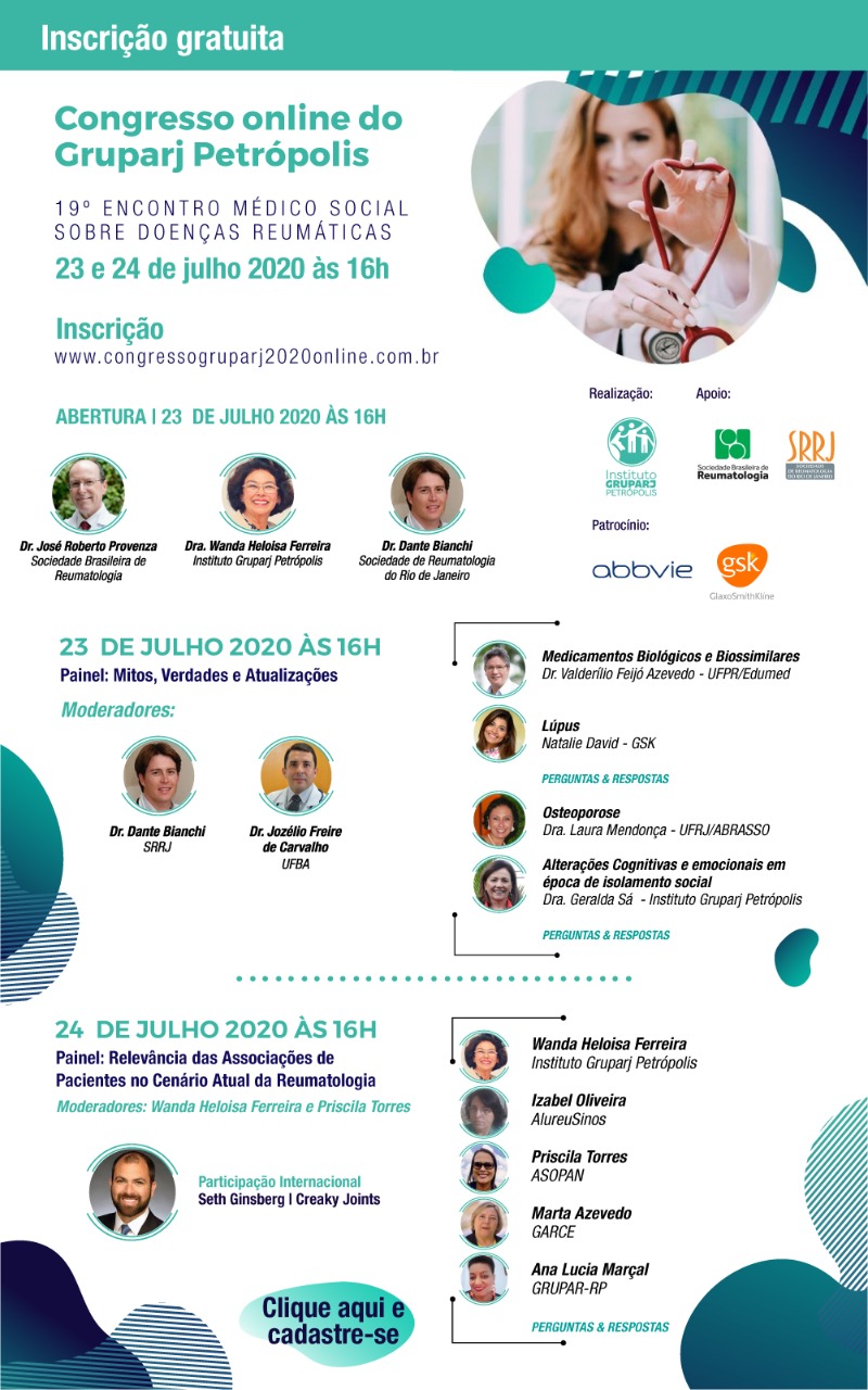 Devido ao cenário de isolamento social pela pandemia, o 19º Encontro Médico Social sobre Doenças Reumáticas realizado anualmente pelo Instituto Gruparj Petrópolis ocorrerá de forma online, nos dias 23 e 24 de julho às 16h, com o apoio da Sociedade Brasileira de Reumatologia e da Sociedade de Reumatologia do Rio de Janeiro. Durante os dois dias de evento, profissionais da área médica e líderes de associações de pacientes do Brasil e dos Estados Unidos, apresentarão os painéis em ambiente virtual. Na pauta, temas como Mitos e verdade sobre Medicações biológicas e biossimilares, Lúpus, Osteoporose, Alterações cognitivas e emocionais em tempos de isolamento social e a Relevância das associações de pacientes no cenário atual da reumatologia, com a participação do representante da associação americana Creaky Joints, Seth Ginsberg.