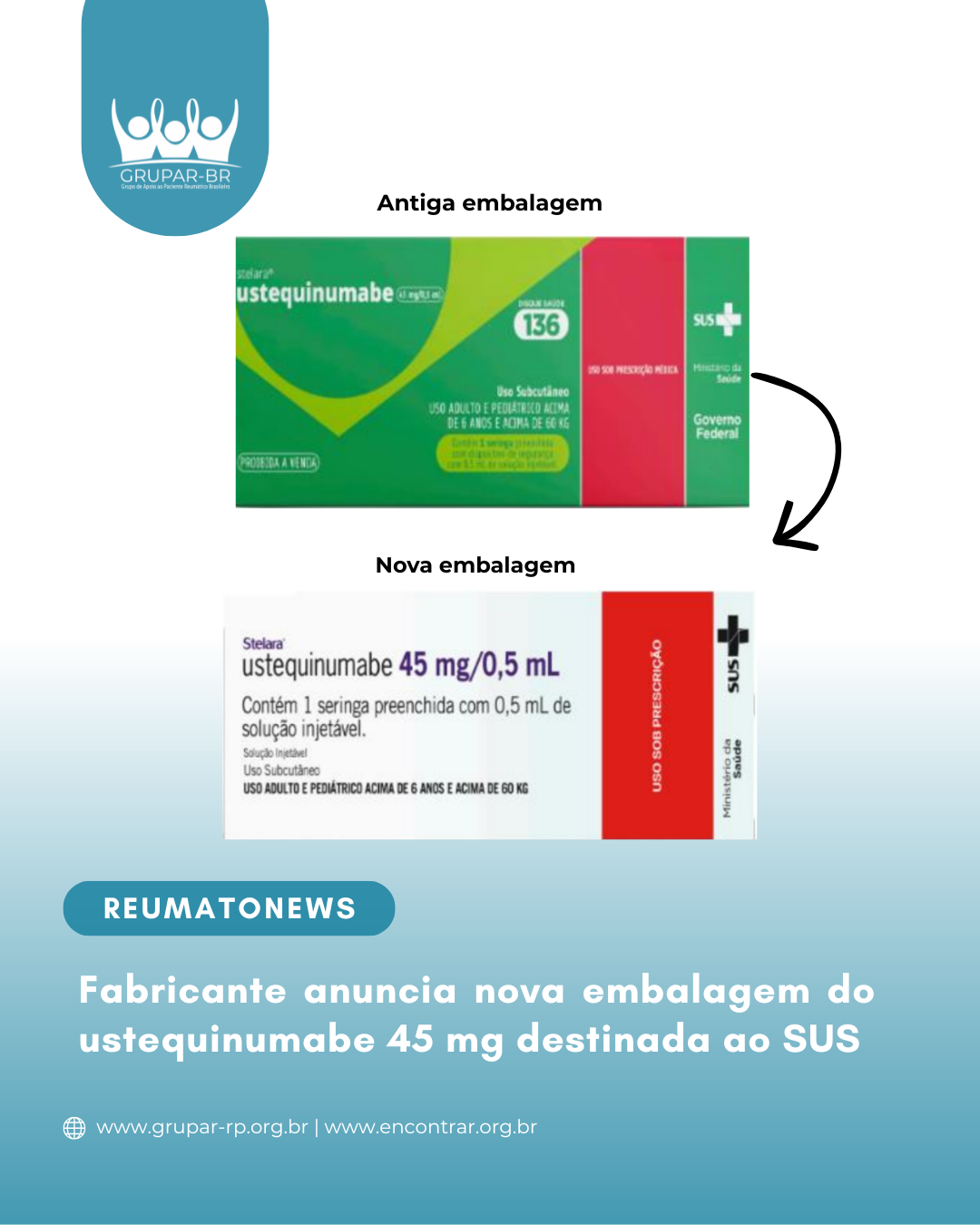 A Johnson & Johnson informou que o medicamento ustequinumabe 45 mg, na apresentação em seringa preenchida destinada ao Sistema Único de Saúde (SUS), passará a contar com uma nova embalagem. A mudança atende à RDC 768/2022 da Agência Nacional de Vigilância Sanitária (Anvisa), que estabelece requisitos atualizados de rotulagem para medicamentos, incluindo aqueles fornecidos ao Ministério da Saúde.