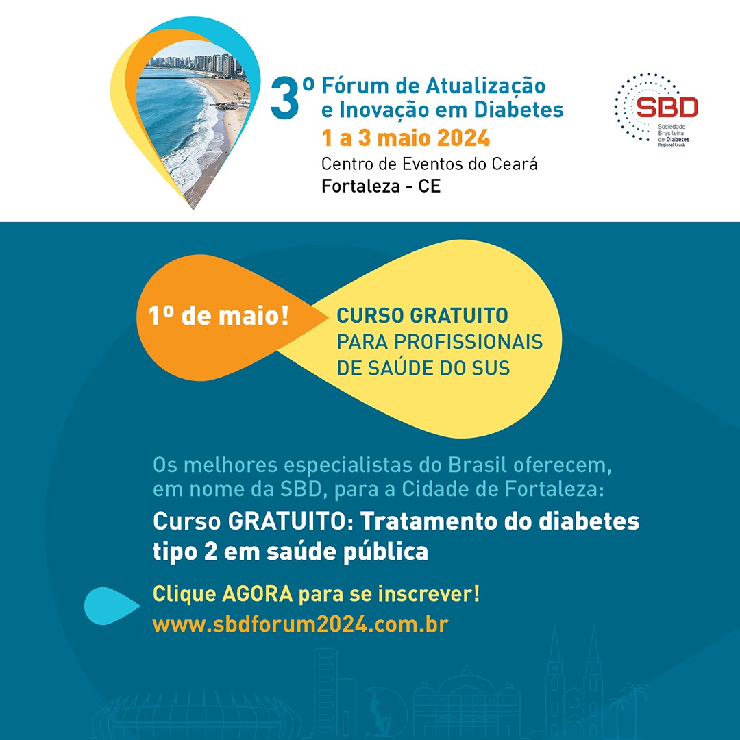 De 1 a 3 de maio a Sociedade Brasileira de Diabetes (SBD) realiza, em Fortaleza, o 3º Fórum de Atualização e Inovação em Diabetes. No evento serão discutidos temas relevantes como Diabetes na Gestação, Diabetes e Fígado, Doença Cardiovascular no Diabetes, Exercício e Diabetes, Tecnologias e Neuropatia e Complicações nos pés, dentre outros.